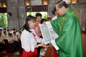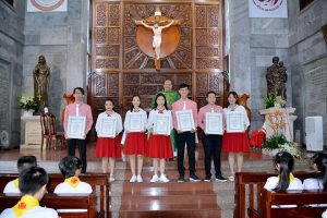 Sau bài giảng, Lm chủ tế trao Bằng bổ nhiệm cho chị Maria Phạm Đặng Ngọc Quỳnh Hương – Ca trưởng 1 ca đoàn Thiên Thần, chị Maria Nguyễn Ngọc Kim Thu – Ca trưởng 2 ca đoàn Thiên Thần, chị Maria Nguyễn Thị Thanh Trúc – Đoàn trưởng ca đoàn Thiên Thần, chị Lucia Lê Nguyễn Thủy Tiên – Đoàn phó ca đoàn Thiên Thần, anh Giuse Nguyễn Trần Mạnh Tấn – Thư ký ca đoàn Thiên Thần, chị Maria Nguyễn Thị Hồng Phương – Thủ quỹ ca đoàn Thiên Thần, và anh Đaminh Đỗ Quốc Thông – cố vấn ca đoàn Thiên Thần nhiệm kì 2020 – 2024 ngay trước thềm cung thánh.