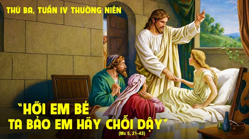 Chúa Giê-su đã không cho phép ai theo mình, ngoài Phê-rô, Gia-cô-bê và Gio-an, khi Người đi vào nhà ông Gia-irô. Quyền năng làm phép lạ của Thiên Chúa thường được thực hiện trong sự thinh lặng, kín đáo, và trong một vòng tròn giới hạn của những người được kêu gọi làm chứng. Khi mọi người than khóc, Người lại tuyên bố một sự thật ngược đời: “Đứa bé không chết đâu, chỉ ngủ đó thôi.” Lời tuyên bố này bị cười nhạo, bởi vì đối với con người, cái chết là một thực tại không thể chối cãi. Nhưng đối với Chúa Giê-su, Đấng là sự sống lại và là sự sống, cái chết chỉ là một giấc ngủ tạm thời. Người đã cầm tay đứa bé và phán một câu bằng tiếng A-ram thân mật, dịu dàng: “Ta-li-tha kum, nghĩa là: Này con, Thầy truyền cho con: chỗi dậy đi!” Một mệnh lệnh đơn giản, nhưng đầy quyền năng. Sự sống đã trở lại. Đứa bé đã trỗi dậy. Mọi sự đã được phục hồi.