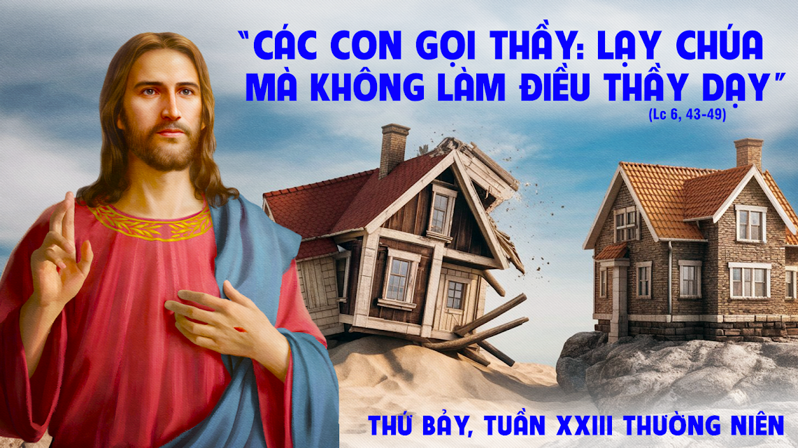 Đức Giê-su không dừng lại ở việc mô tả, nhưng Ngài tiếp tục chất vấn sâu sắc: “Tại sao anh em gọi Thầy: ‘Lạy Chúa! Lạy Chúa!’, mà anh em không làm điều Thầy dạy?” Đây là lời trách yêu nhưng đầy cương quyết. Chúa Giê-su không muốn một thứ đạo đức hình thức, một tôn giáo chỉ có tiếng hô danh Ngài mà không có đời sống thực hành. Ngài không cần những lời tung hô trống rỗng, nhưng muốn một con tim biết lắng nghe và một đôi tay sẵn sàng thi hành. Gọi Chúa là “Lạy Chúa!” phải gắn liền với hành động bước theo Chúa. Danh xưng ấy không thể chỉ nằm trên môi miệng, mà phải thấm vào từng quyết định, từng chọn lựa của đời sống. Nếu không, chúng ta sẽ giống như người xây nhà không nền móng – chỉ cần một cơn lũ tràn qua, tất cả sẽ sụp đổ tan tành.