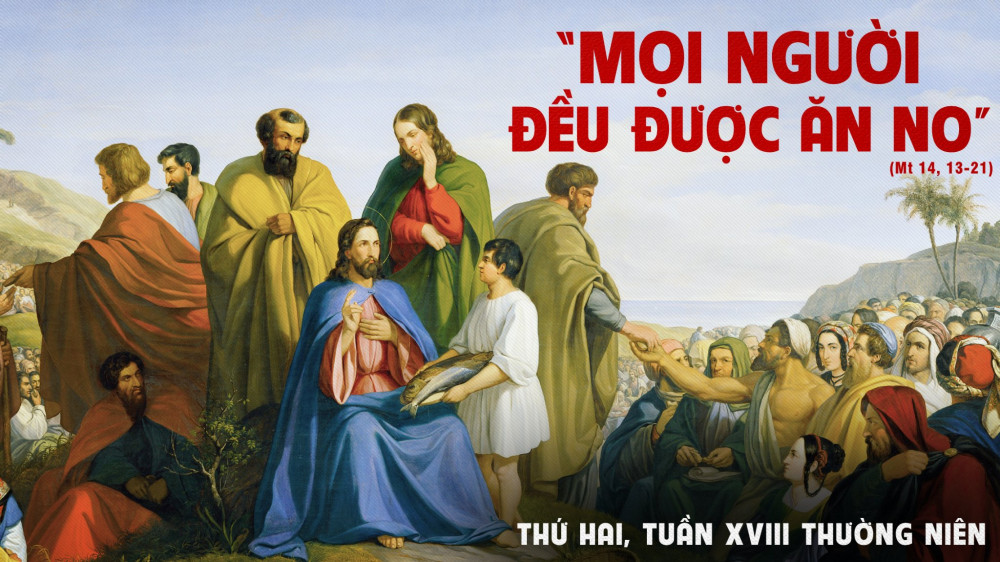 Tin mừng hôm nay Thánh Matthêu thuật lại việc Chúa làm phép lạ hóa bánh và cá ra nhiều để cho hàng ngàn người theo Chúa được ăn no nê. Trình thuật ghi lại : “ Dân chúng nghe biết thì từ các thành phố đi bộ theo Người. Ra khỏi thuyền Người that dân chúng đông đảo thì thương xót họ và chữa những người bệnh tật trong họ”. Những người đi theo Chúa, dám bỏ hết công việc , quên cả ăn uống . Họ lắng nghe lời Chúa, họ chạy đến kêu cầu Chúa và được Chúa chữa lành mọi bệnh tật linh hồn và thể xác. Chúa không chỉ ban LỜI của Người, Chúa còn quan tâm đến nhu cầu cơ bản của mỗi người về cuộc sống, về ăn uống, nghỉ ngơi. Còn các tông đồ thì ngược lại “Xin Thầy giải tán dân chúng để họ vào các làng mạc mà mua thức ăn”.