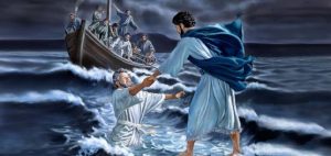 Sau khi nghe các môn đệ cầu cứu, Chúa Giêsu đã đi trên mặt biển đến và trấn an các ông: “Cứ yên tâm, chính Thầy đây, đừng sợ!” Sau đó Chúa Giêsu truyền cho ông Phêrô đi trên mặt nước mà đến với Người. Nhưng Phêrô vẫn hoảng sợ đễn nỗi Đức Giêsu phải đưa tay ra nắm lấy ông.
